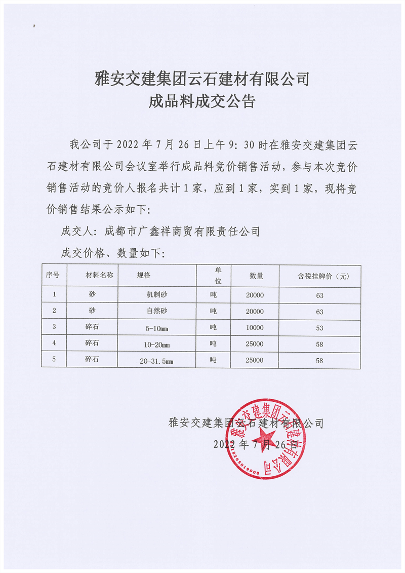 雅安交建集團(tuán)云石建材有限公司成品料競(jìng)價(jià)銷售成交公告7.26