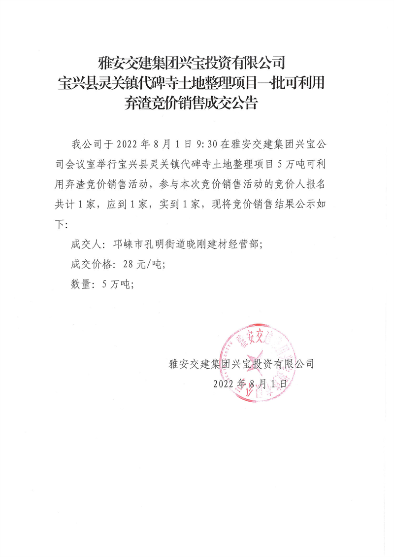 雅安交建集團(tuán)興寶投資有限公司靈關(guān)鎮(zhèn)代碑寺土地整理項(xiàng)目5萬(wàn)噸可利用棄渣競(jìng)價(jià)銷售成交公告(2022.8.1)