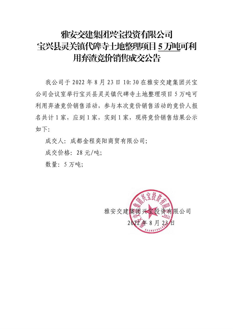 雅安交建集團(tuán)興寶投資有限公司寶興縣靈關(guān)鎮(zhèn)代碑寺土地整理項目10萬噸可利用棄渣競價銷售成交公告(8.23)