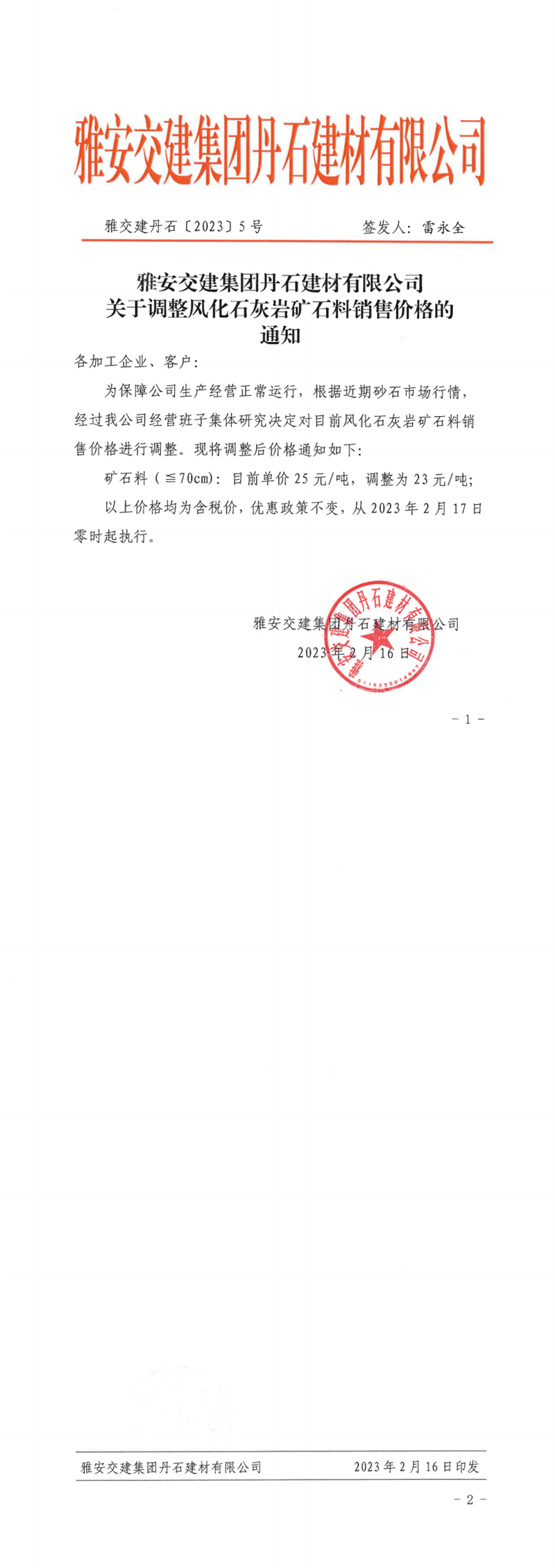 雅交建丹石(2023)5號調(diào)整風(fēng)化石灰?guī)r礦料銷售價(jià)格的通知(2023.02.16)