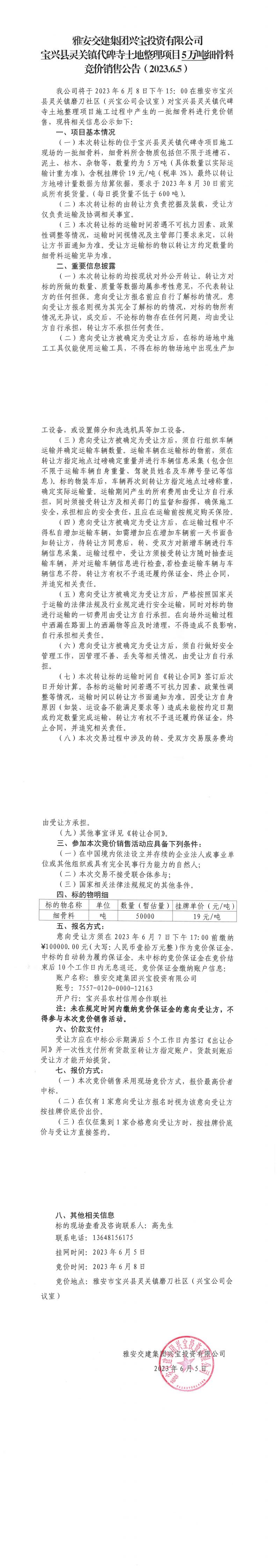 雅安交建集團興寶投資有限公司寶興縣靈關(guān)鎮(zhèn)代碑寺土地整理項目5萬噸細(xì)骨料競價銷售公告(2023.6.5)
