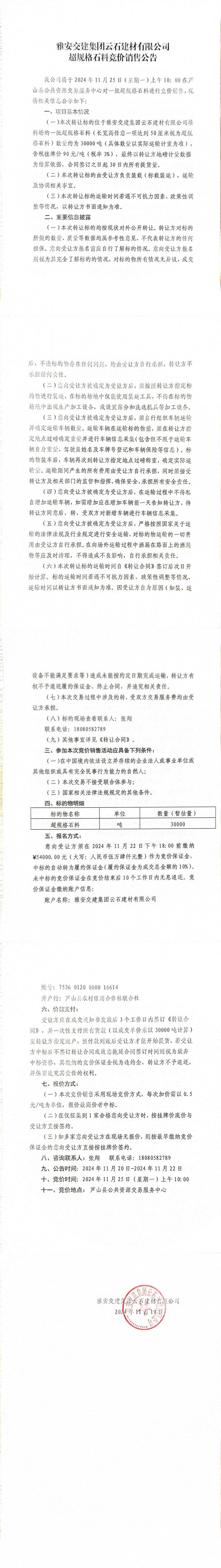 雅安交建集團(tuán)云石建材有限公司超規(guī)格石料競價(jià)銷售公告(2024-11-19)