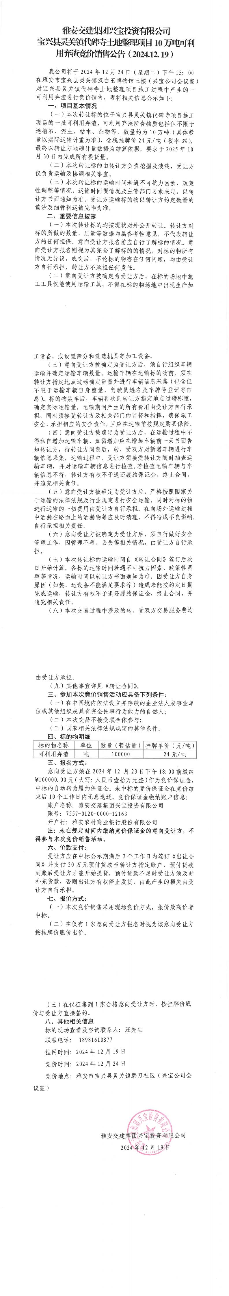 雅安交建集團(tuán)興寶投資有限公司靈關(guān)鎮(zhèn)代碑寺土地整理項(xiàng)目10萬噸可利用棄渣競價(jià)銷售公告(2024.12.19)