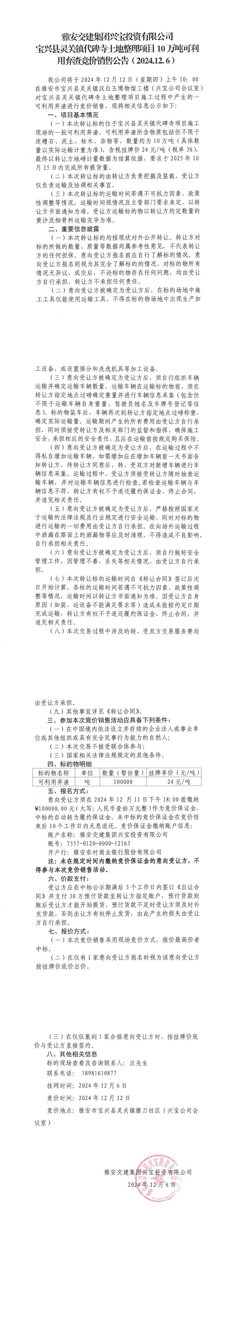 雅安交建集團(tuán)興寶投資有限公司靈關(guān)鎮(zhèn)代碑寺土地整理項(xiàng)目10萬(wàn)噸可利用棄渣競(jìng)價(jià)銷售公告(2024.12.06)