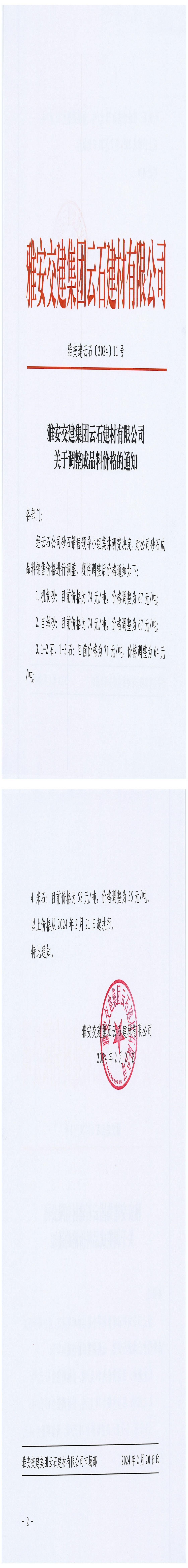 雅安交建集團(tuán)云石建材有限公司成品料價(jià)格調(diào)整公告(2024-2-21)