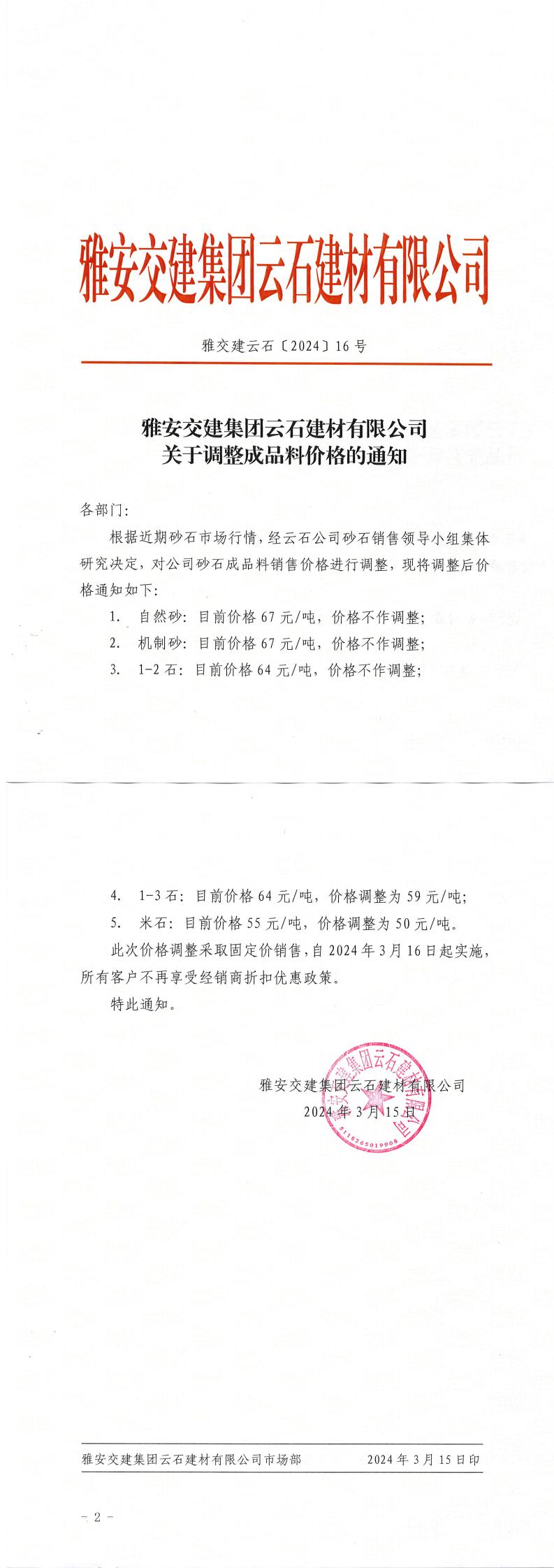 ÑŰ²½»½¨¼¯ˆF(tu¨¢n)ÔÆÊ¯½¨²ÄÓÐÏÞ¹«Ë¾³ÉÆ·Áσr¸ñÕ{(di¨¤o)Õû¹«¸æ£¨2024-2-21£©